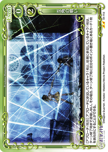 | [アプローチ/両方]:アプローチに参加しているキャラ1枚と、妨害に参加しているキャラ1枚は、ターン終了時まで退場しない。その場合、ターン終了時に自分のポイント置き場にあるカード1枚を表向きにすることができる。 | ||