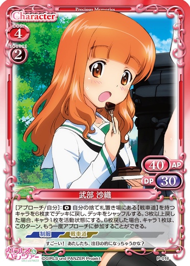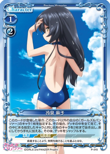 | 自分の「西住 みほ」または「冷泉 麻子」または「武部 沙織」または「五十鈴 華」が登場した場合、このカードをデッキの下に移す。その場合、カードを1枚引く。登場したキャラのコストの値が3以上の場合、カードを1枚引く。 | ||