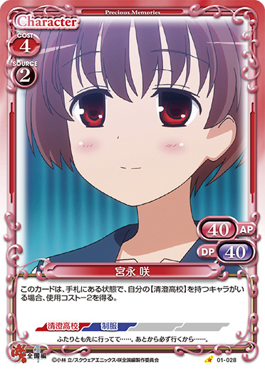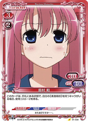 | このカードは、手札にある状態で、自分の【清澄高校】を持つキャラがいる場合、使用コスト-2を得る。 | ||