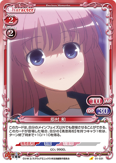 | このカードは、自分のメインフェイズ以外でも登場させることができる。このカードが登場した場合、自分の【清澄高校】を持つキャラ1枚は、ターン終了時まで+10/+10を得る。 | ||