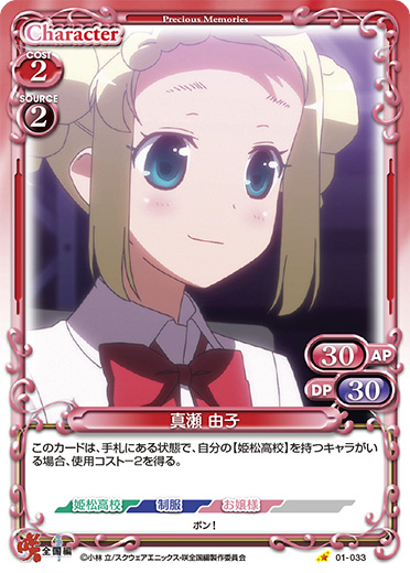 | このカードは、手札にある状態で、自分の【姫松高校】を持つキャラがいる場合、使用コスト-2を得る。 | ||