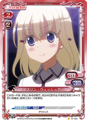 | このカードは、手札にある状態で、自分の【宮守女子高校】を持つキャラがいる場合、使用コスト-2を得る。 | ||