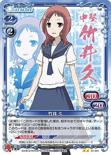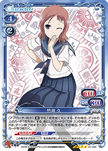| [アプローチ/両方]:《0》手札1枚を捨て札にする。その場合、デッキの上のカード1枚を表にする。表にしたカードが「竹井 久」の場合、このカードは、ターン終了時まで+30/+30を得る。その場合、ターン終了時にカードを3枚引く。 | ||
