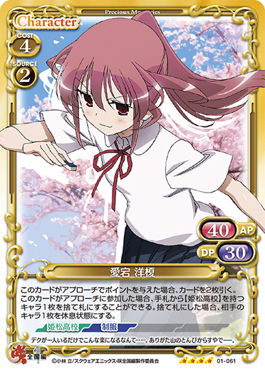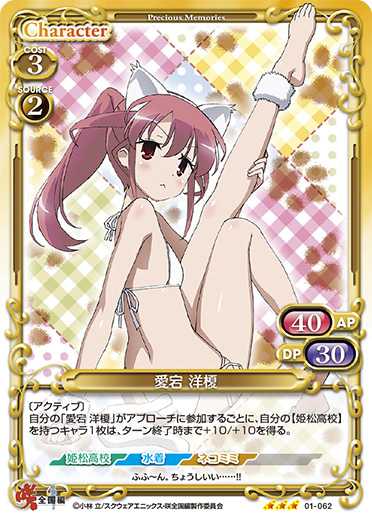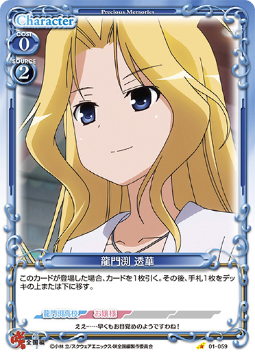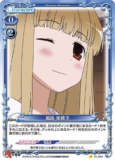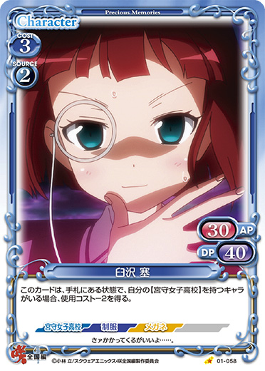 | このカードは、手札にある状態で、自分の【宮守女子高校】を持つキャラがいる場合、使用コスト-2を得る。 | ||