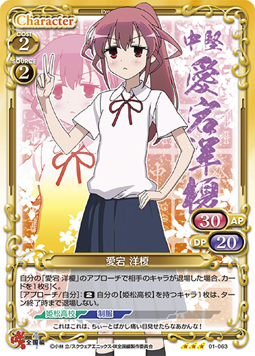 | 自分の「愛宕 洋榎」のアプローチで相手のキャラが退場した場合、カードを1枚引く。[アプローチ/自分]:《2》自分の【姫松高校】を持つキャラ1枚は、ターン終了時まで退場しない。 | ||