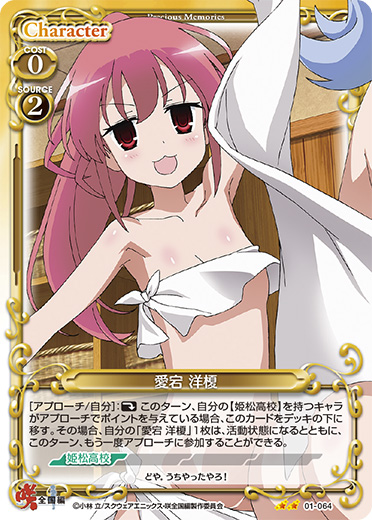 | [アプローチ/自分]:《休》このターン、自分の【姫松高校】を持つキャラがアプローチでポイントを与えている場合、このカードをデッキの下に移す。その場合、自分の「愛宕 洋榎」1枚は、活動状態になるとともに、このターン、もう一度アプローチに参加することができる。 | ||
