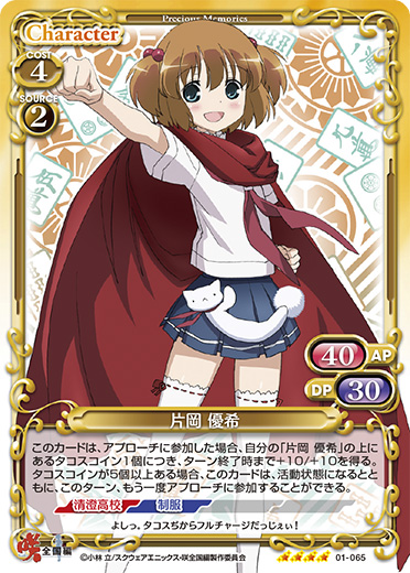 | このカードは、アプローチに参加した場合、自分の「片岡 優希」の上にあるタコスコイン1個につき、ターン終了時まで+10/+10を得る。タコスコインが5個以上ある場合、このカードは、活動状態になるとともに、このターン、もう一度アプローチに参加することができる。 | ||