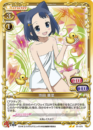 | 〔アクティブ〕このカードは、自分のメインフェイズ以外でも登場させることができる。このカードが登場した場合、自分のキャラ1枚を活動状態にすることができる。 | ||
