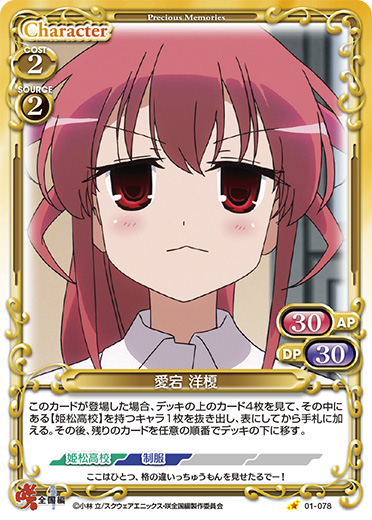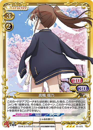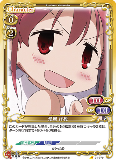 | このカードが登場した場合、自分の【姫松高校】を持つキャラ2枚は、ターン終了時まで+20/+20を得る。 | ||