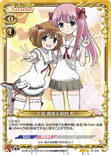 | 〔コンビ〕このカードが登場した場合、自分の捨て札置き場にある『咲-Saki-全国編』のキャラを2枚まで手札に戻すことができる。 | ||