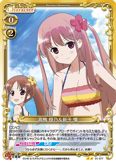 | 〔コンビ〕自分の『咲-Saki-全国編』のキャラがアプローチでポイントを与えた場合、デッキの中を全て見て、その中にあるカード1枚を抜き出し、このカードをデッキに戻し、デッキをシャッフルする。その後、抜き出したカードをデッキの上に置く。 | ||