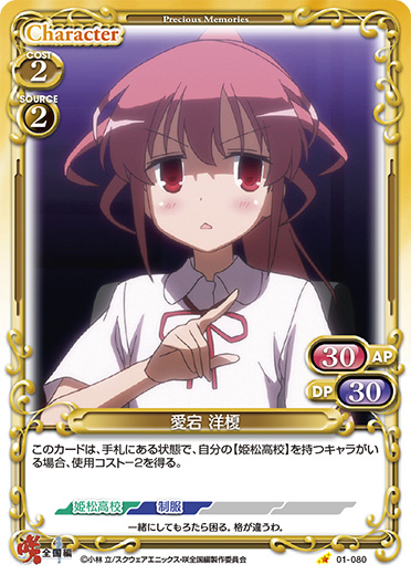 | このカードは、手札にある状態で、自分の【姫松高校】を持つキャラがいる場合、使用コスト-2を得る。 | ||