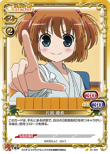 | このカードは、手札にある状態で、自分の【清澄高校】を持つキャラがいる場合、使用コスト-2を得る。 | ||