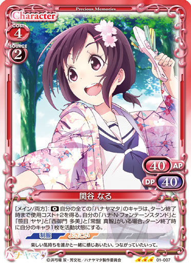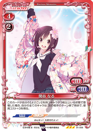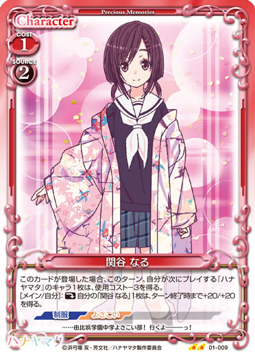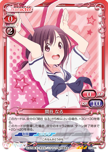 | このカードが登場した場合、このターン、自分が次にプレイする『ハナヤマタ』のキャラ1枚は、使用コスト-3を得る。[メイン/自分]:《休》自分の「関谷 なる」1枚は、ターン終了時まで+20/+20を得る。 | ||