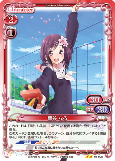 | このカードは、「関谷 なる」のコストとして使用する場合、発生コスト+2を得る。このカードが登場した場合、このターン、自分が次にプレイする「関谷 なる」1枚は、使用コスト-4を得る。 | ||