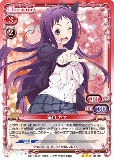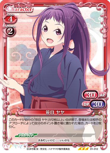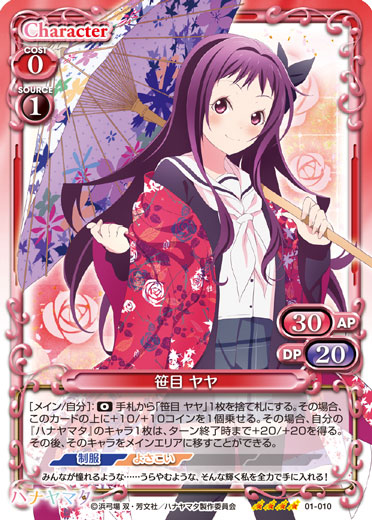| [メイン/自分]:《0》手札から「笹目 ヤヤ」1枚を捨て札にする。その場合、このカードの上に+10/+10コインを1個乗せる。その場合、自分の『ハナヤマタ』のキャラ1枚は、ターン終了時まで+20/+20を得る。その後、そのキャラをメインエリアに移すことができる。 | ||