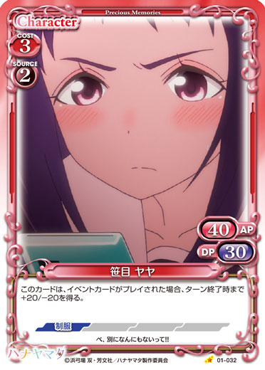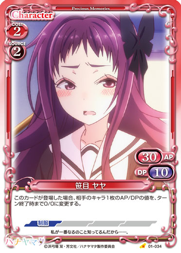 | このカードが登場した場合、相手のキャラ1枚のAP/DPの値を、ターン終了時まで0/0に変更する。 | ||