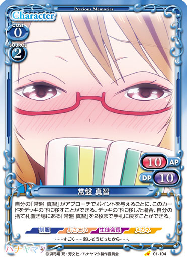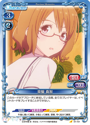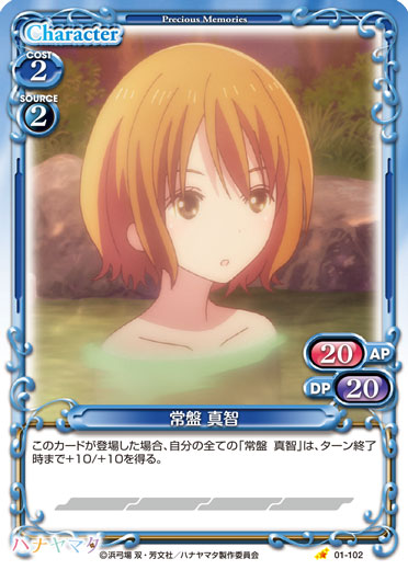 | 自分の「常盤 真智」がアプローチでポイントを与えるごとに、このカードをデッキの下に移すことができる。デッキの下に移した場合、自分の捨て札置き場にある「常盤 真智」を2枚まで手札に戻すことができる。 | ||