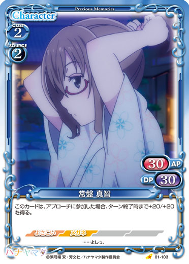 | このカードが登場した場合、自分の全ての「常盤 真智」は、ターン終了時まで+10/+10を得る。 | ||