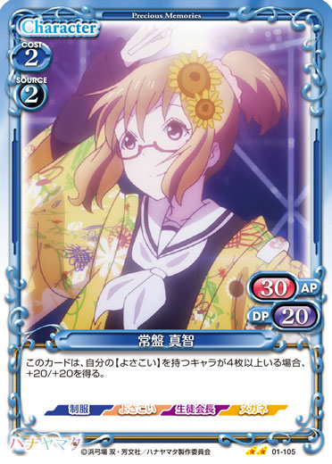 | このカードは、自分の【よさこい】を持つキャラが4枚以上いる場合、+20/+20を得る。 | ||