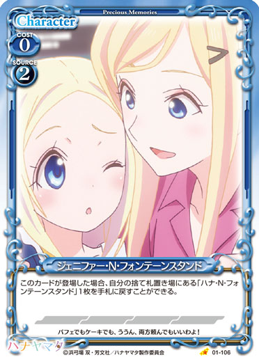| このカードが登場した場合、自分の捨て札置き場にある「ハナ・N・フォンテーンスタンド」1枚を手札に戻すことができる。 | ||