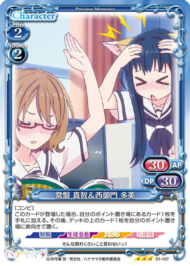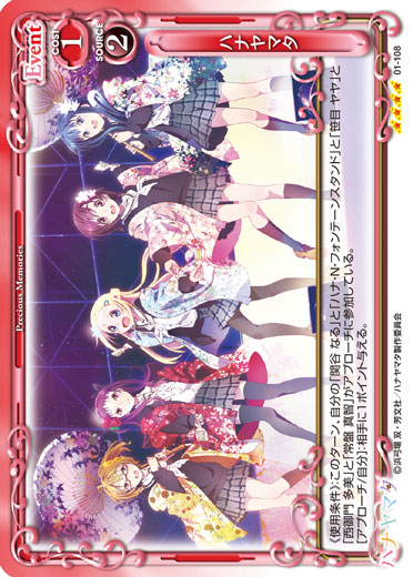 | 《使用条件》:このターン、自分の「関谷 なる」と「ハナ・N・フォンテーンスタンド」と「笹目 ヤヤ」と「西御門 多美」と「常盤 真智」がアプローチに参加している。[アプローチ/自分]:相手に1ポイント与える。 | ||