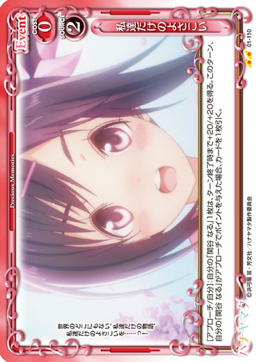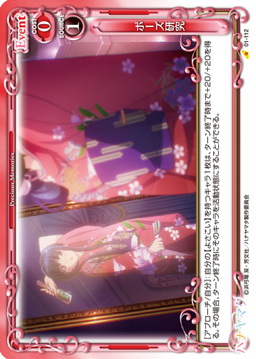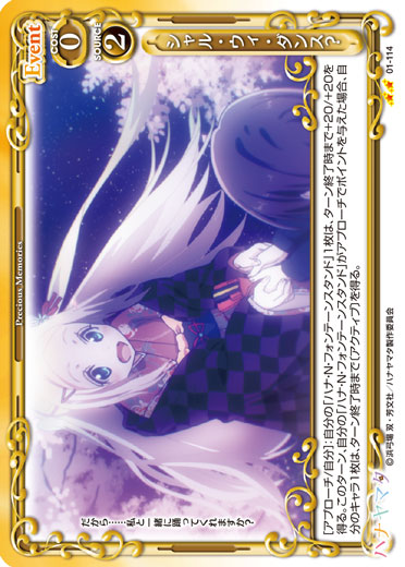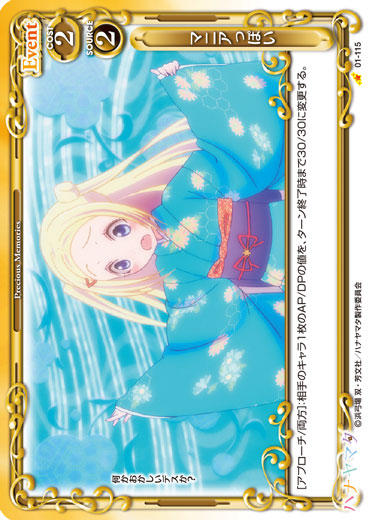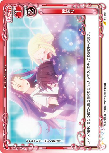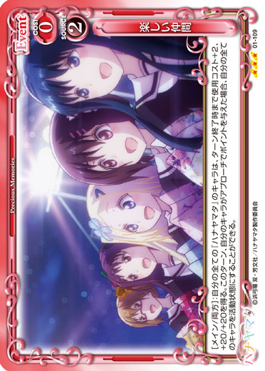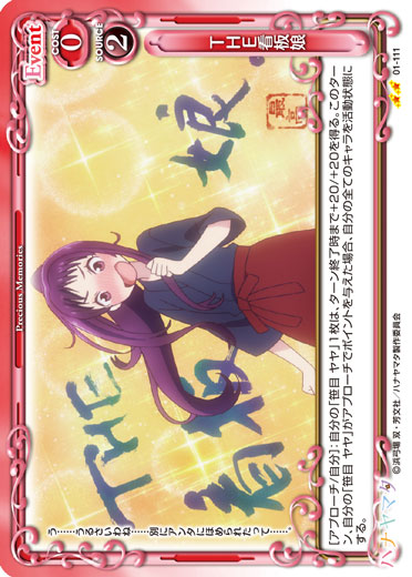 | [メイン/両方]:自分の全ての『ハナヤマタ』のキャラは、ターン終了時まで使用コスト+2、+20/+20を得る。このターン、自分のキャラがアプローチでポイントを与えた場合、自分の全てのキャラを活動状態にすることができる。 | ||
