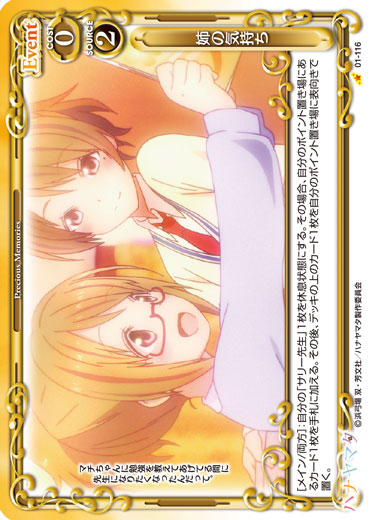 | [メイン/相手]:自分の捨て札置き場にある『ハナヤマタ』のキャラ2枚を手札に戻す。 | ||