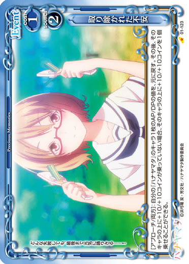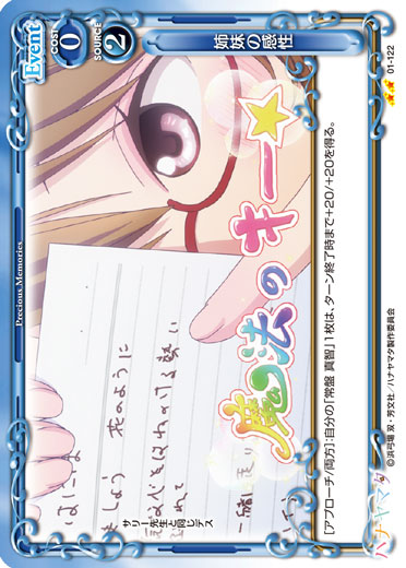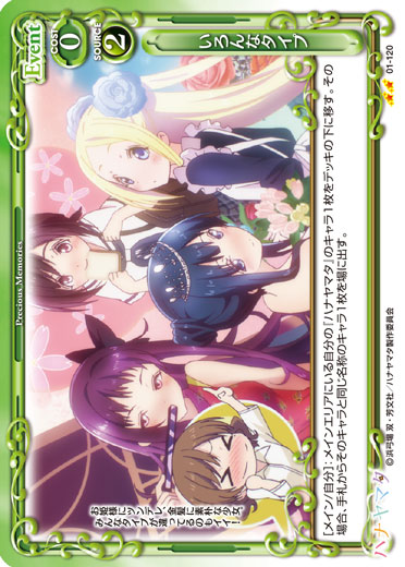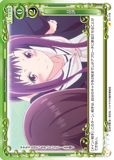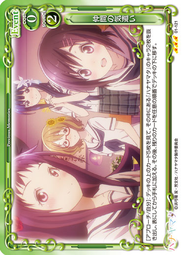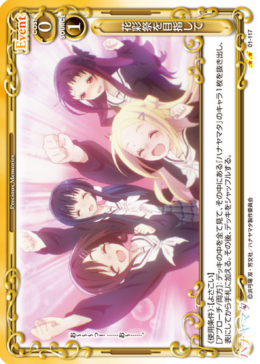 | [アプローチ/自分]:デッキの上のカード5枚を見て、その中にある『ハナヤマタ』のキャラ2枚を抜き出し、表にしてから手札に加える。その後、残りのカードを任意の順番でデッキの下に移す。 | ||
