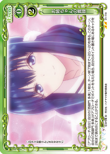 | [アプローチ/自分]:自分の「西御門 多美」1枚は、ターン終了時まで+20/+20を得る。このターン、自分の「西御門 多美」がアプローチでポイントを与えた場合、自分のポイント置き場にあるキャラを2枚まで表向きにすることができる。 | ||