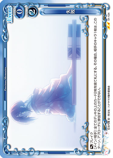 | 〔ブレイク〕[メイン/相手]:全てのデッキの上のカード2枚を捨て札にする。その場合、相手のキャラ1枚は、このターン、アプローチに参加することができない。 | ||