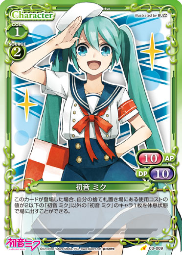 | このカードが登場した場合、自分の捨て札置き場にある使用コストの値が2以下の「初音 ミク」以外の『初音 ミク』のキャラ1枚を休息状態で場に出すことができる。 | ||