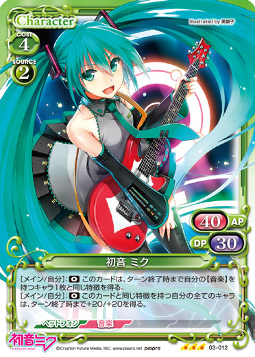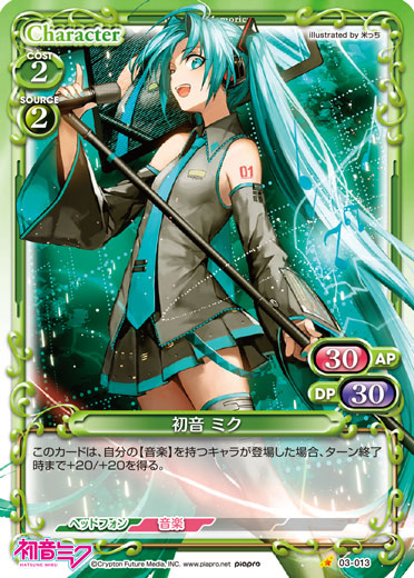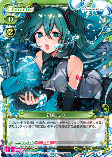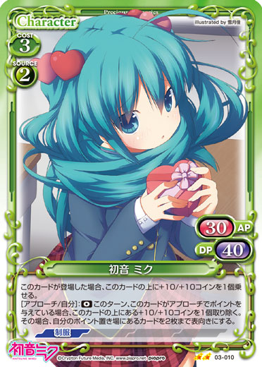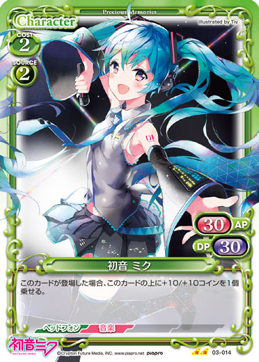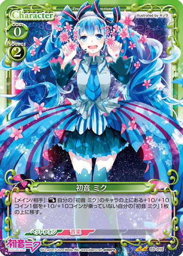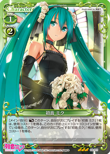| [メイン/自分]:《休》このターン、自分が次にプレイする「初音 ミク」1枚は、使用コスト-1を得る。このカードの上に+10/+10コインが乗っている場合、このターン、自分が次にプレイする「初音 ミク」1枚は、使用コスト-1を得る。 | ||