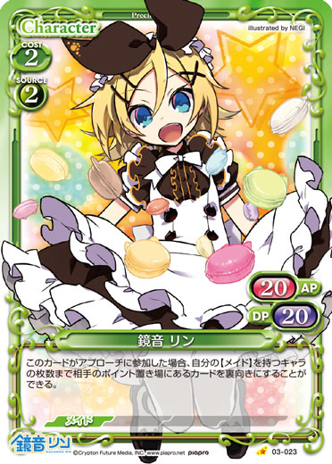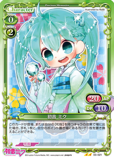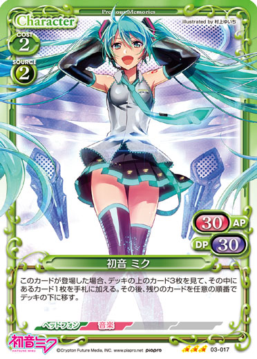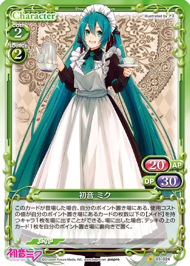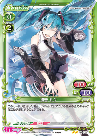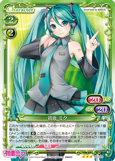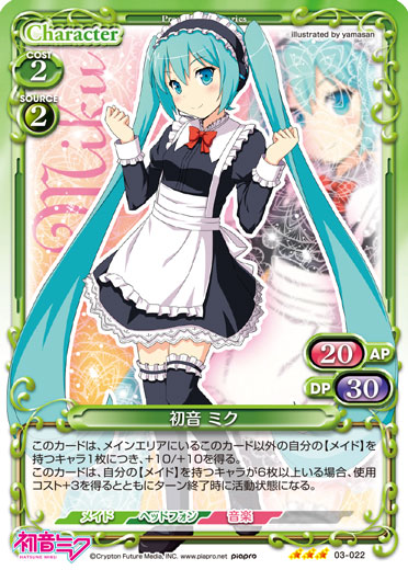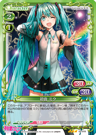 | このカードは、アプローチに参加した場合、ターン終了時までこのカード以外の自分の「初音 ミク」1枚のAP/DPと同じ値のAP/DPの修正を得る。 | ||