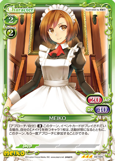 | 〔コンビ〕[メイン/両方]:《0》自分の捨て札置き場にある【メイド】を持つキャラ1枚をデッキの下に移す。その場合、このカードは、ターン終了時まで、そのキャラと同じテキストと、そのキャラのAP/DPと同じ値のAP/DPの修正を得る。 | ||