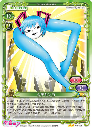 | このカードは、デッキに5枚以上入れることができ、このカードと同じキャラがいても場に出すことができる。このカードは、アプローチまたは妨害に参加した場合、デッキの上のカードを、「シテヤンヨ」の枚数と同じ枚数までゲームから取り除き、その枚数1枚につき、ターン終了時まで+10/+10を得る。 | ||