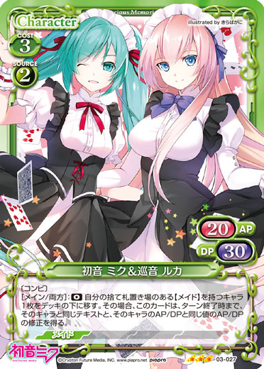 | 〔コンビ〕このカードが登場した場合、メインエリアにいるこのカードと同じ名称の自分のキャラの枚数以下の使用コストの値を持つ、自分の捨て札置き場にある「初音 ミク」または「鏡音 リン」1枚をサポートエリアに出すことができる。 | ||