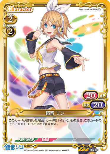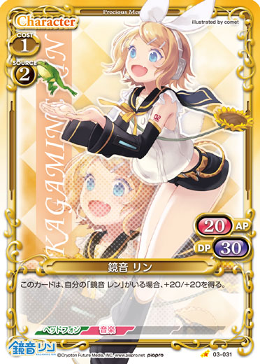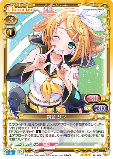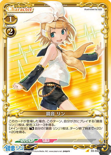 | このカードが登場した場合、このターン、自分が次にプレイする「鏡音 リン」1枚は、使用コスト-3を得る。[メイン/自分]:《休》自分の「鏡音 リン」1枚は、ターン終了時まで+20/+20を得る。 | ||