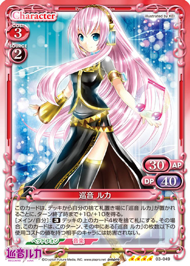 | このカードが登場した場合、このターン、自分が次にプレイする「巡音 ルカ」1枚は、使用コスト-3を得る。[メイン/自分]:《休》自分の「巡音 ルカ」1枚は、ターン終了時まで+20/+20を得る。 | ||