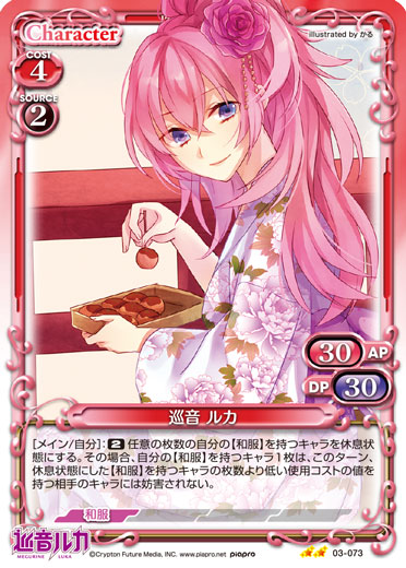 | [メイン/自分]:《2》任意の枚数の自分の【和服】を持つキャラを休息状態にする。その場合、自分の【和服】を持つキャラ1枚は、このターン、休息状態にした【和服】を持つキャラの枚数より低い使用コストの値を持つ相手のキャラには妨害されない。 | ||