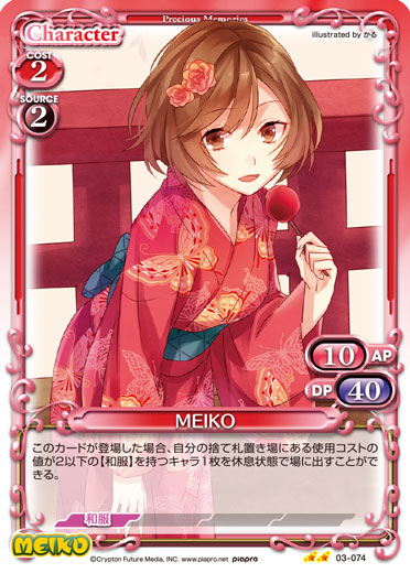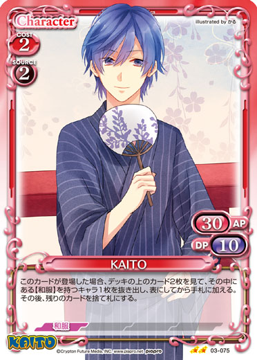 | このカードが登場した場合、デッキの上のカード2枚を見て、その中にある【和服】を持つキャラ1枚を抜き出し、表にしてから手札に加える。その後、残りのカードを捨て札にする。 | ||