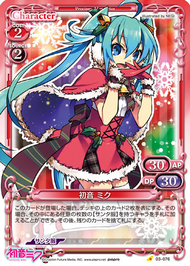 | このカードが登場した場合、デッキの上のカード2枚を表にする。その場合、その中にある任意の枚数の【サンタ服】を持つキャラを手札に加えることができる。その後、残りのカードを捨て札にする。 | ||