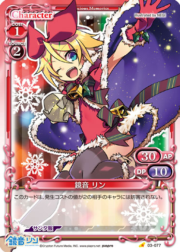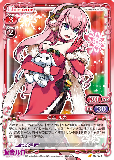 | このカード以外の自分の【サンタ服】を持つキャラが登場した場合、デッキの上のカード2枚を捨て札にすることができる。捨て札にした場合、このターン、自分が次にプレイする【サンタ服】を持つキャラ1枚は、使用コスト-1を得る。 | ||