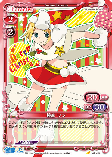 | このカードが手札から【サンタ服】を持つキャラのコストとして使用された場合、自分のポイント置き場にあるカード1枚を表向きにすることができる。 | ||
