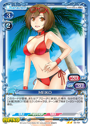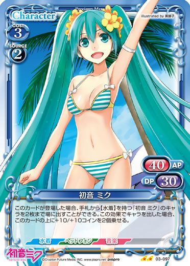 | このカードが登場した場合、手札から【水着】を持つ『初音 ミク』のキャラを2枚まで場に出すことができる。この効果でキャラを出した場合、このカードの上に+10/+10コインを2個乗せる。 | ||