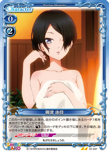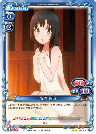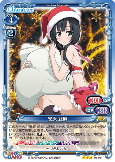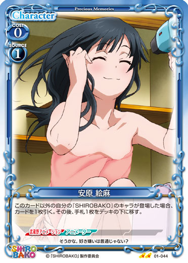 | このカード以外の自分の『SHIROBAKO』のキャラが登場した場合、カードを1枚引く。その後、手札1枚をデッキの下に移す。 | ||