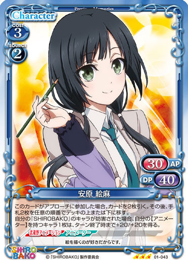 | このカードがアプローチに参加した場合、カードを2枚引く。その後、手札2枚を任意の順番でデッキの上または下に移す。自分の『SHIROBAKO』のキャラが妨害された場合、自分の【アニメーター】を持つキャラ1枚は、ターン終了時まで+20/+20を得る。 | ||