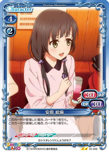 | このカードが「安原 絵麻」以外の自分の『SHIROBAKO』のキャラがいる状態で登場した場合、カードを2枚引く。[アプローチ/相手]:《2》デッキの上のカードを2枚見て、その中にあるカード1枚を手札に加える。 | ||