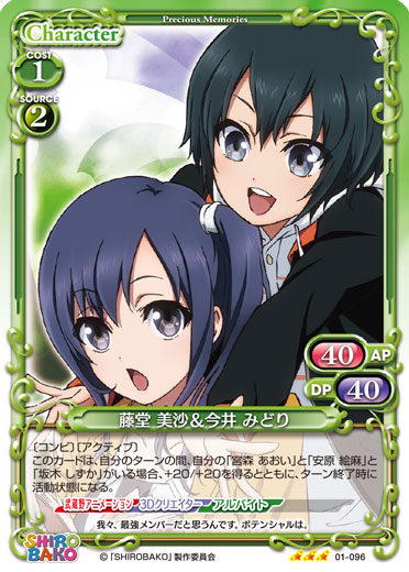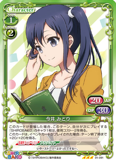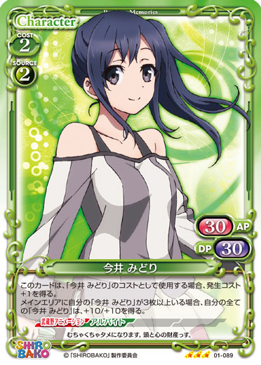 | このカードは、「今井 みどり」のコストとして使用する場合、発生コスト+1を得る。メインエリアに自分の「今井 みどり」が3枚以上いる場合、自分の全ての「今井 みどり」は、+10/+10を得る。 | ||