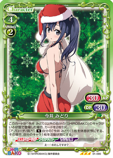 | このカードが「今井 みどり」以外の自分の『SHIROBAKO』のキャラがいる状態で登場した場合、カードを2枚引く。[アプローチ/両方]:《1》自分の「今井 みどり」1枚を休息状態にする。その場合、自分のキャラ1枚を活動状態にする。 | ||